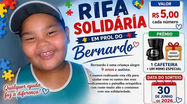 A solidariedade é, muitas vezes, a principal aliada de famílias que lutam para garantir saúde e qualidade de vida aos seus filhos. É com esse espírito de união que familiares e amigos do pequeno Bernardo estão mobilizando a comunidade através de uma "Rifa Solidária" online.