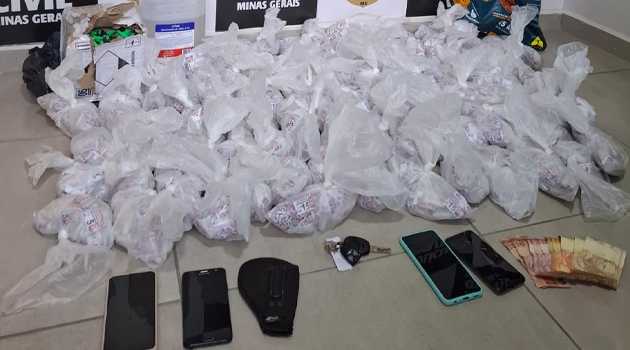 Além do grande volume de entorpecentes, a Polícia Civil apreendeu aparelhos celulares, um veículo, um coldre e cerca de R$ 200,00 em dinheiro vivo.