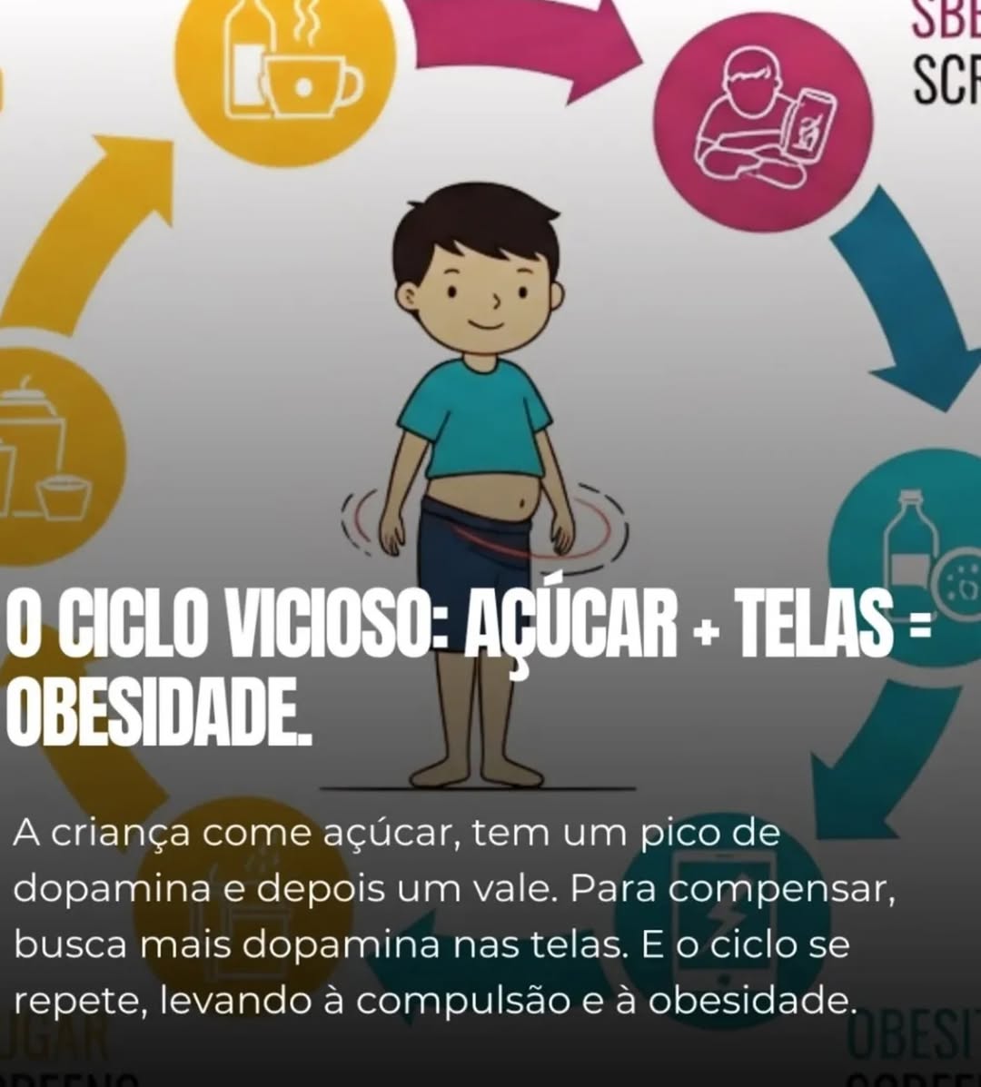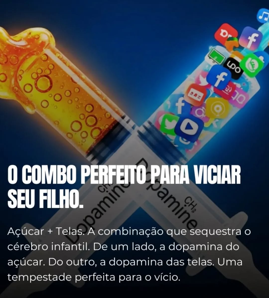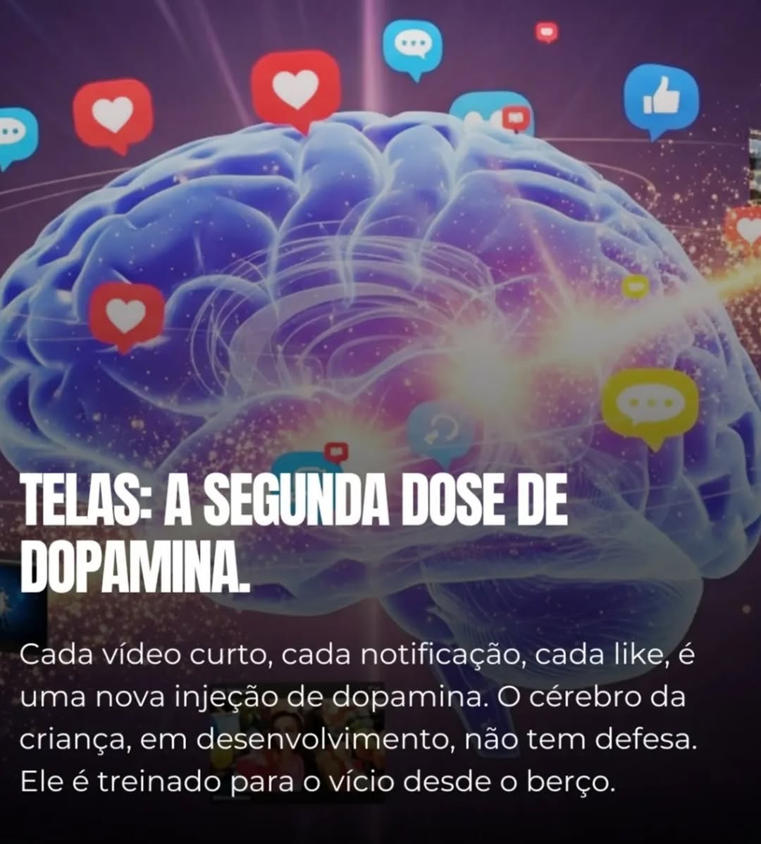 Um neuropediatra do Hospital das Clínicas, explica: "O cérebro infantil é particularmente vulnerável. Cada ingestão de açúcar refinado ativa os mesmos centros de prazer que substâncias como a cocaína. Da mesma forma, cada vídeo curto, like ou notificação fornece uma microdosagem de dopamina, o neurotransmissor do prazer".