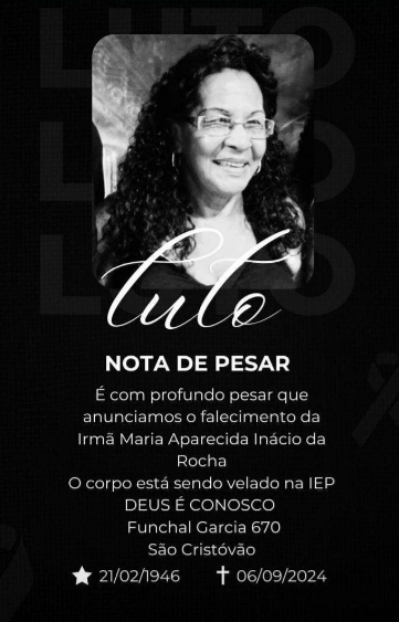 O velório está sendo realizado na IEP Deus é Conosco, na R. Funchal Garcia, 670, Bairro São Cristóvão em Leopoldina.