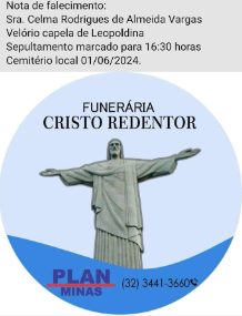 O velório será realizado na Capela de Leopoldina, com o sepultamento marcado para as 16:30 horas de hoje (01 de junho), no Cemitério Local.