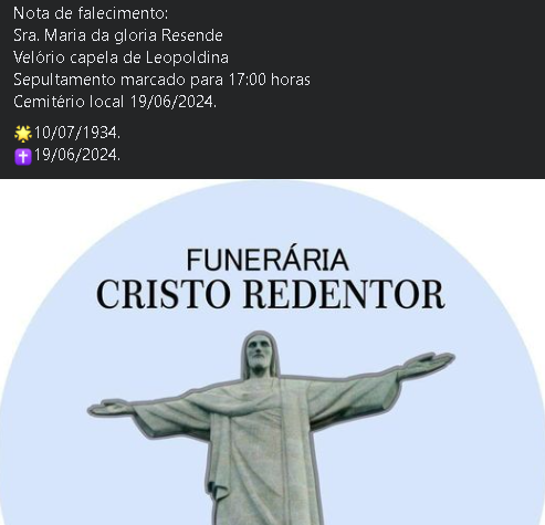 Comunicamos com pesar o falecimento da Sra. Maria da Gloria Resende, de 89 anos.
