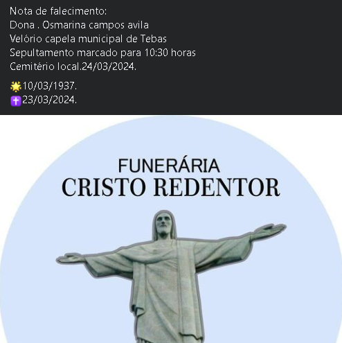 Comunicamos com pesar o falecimento da Sra. Osmarina Campos Avila, de 87 anos.