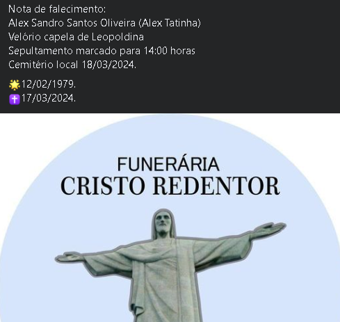 Comunicamos com pesar o falecimento de Alex Sandro Santos Oliveira (Alex Tatinha), de 45 anos.
