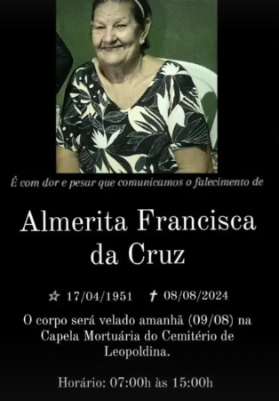 Comunicamos com pesar o falecimento de Almerita Francisca da Cruz, de 73 anos.