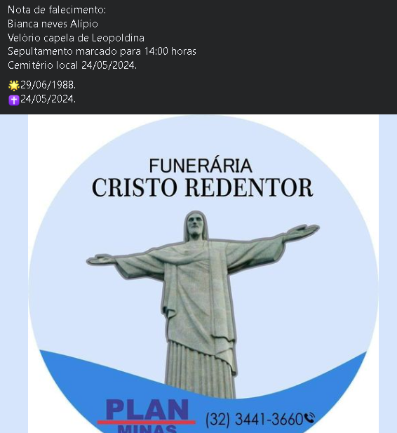 O sepultamento será na sexta-feira (24 de maio), às 14:00h, no Cemitério de Leopoldina.