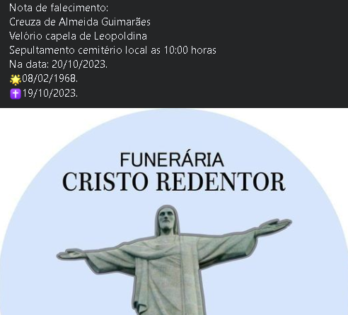 O velório será na Capela Mortuária Lions Clube, em Leopoldina, até as 10:00h da sexta-feira (20 de outubro).