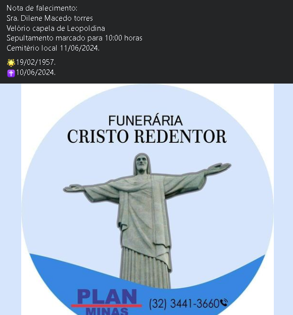 O sepultamento está marcado para as 10:00h da terça-feira (11 de junho), no Cemitério de Leopoldina.