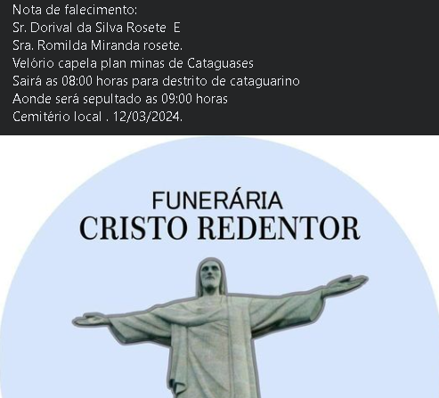 O velório será na Capela Plan Minas, em Cataguases. Até as 08:00h da terça-feira (12 de março) quando sairá para o Distrito de Cataguarino.