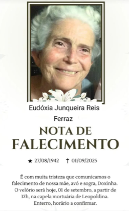 Com pesar, comunicamos o falecimento de Eudóxia Junqueira Reis Ferraz, 82 anos.