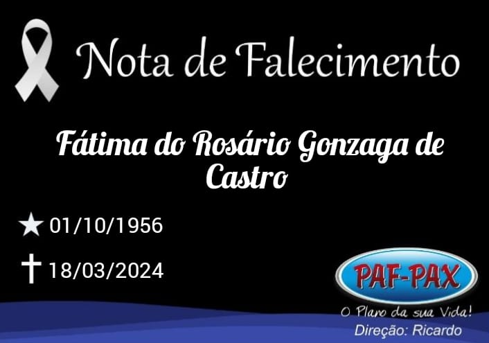 Comunicamos com pesar o falecimento de Fátima do Rosário Gonzaga de Castro, de 67 anos.
