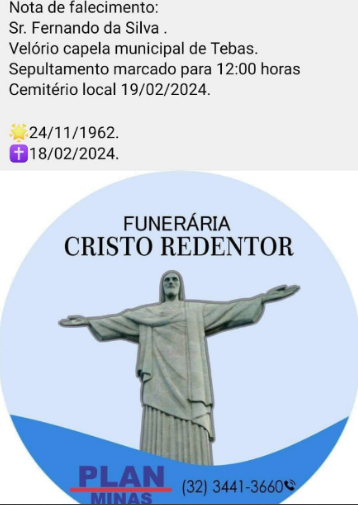 O sepultamento será às 12:00h, da segunda-feira (19 de fevereiro), no cemitério local.