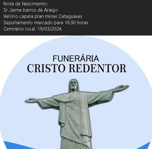 O sepultamento será às 16:30h, da terça-feira (19 de março), no Cemitério de Cataguases.