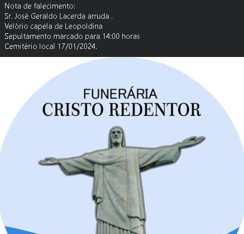 Sepultamento na quarta-feira (17 de janeiro), às 14:00 no Cemitério Local.