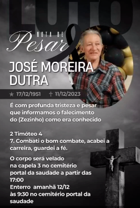 Comunicamos com pesar o falecimento de José Moreira Dutra (Zezinho).
