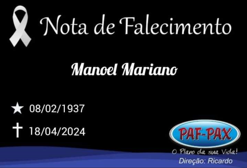 Comunicamos com pesar o falecimento de Manoel Mariano, de 87 anos.