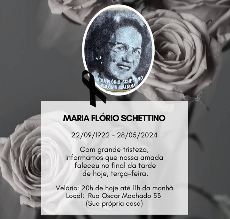 Comunicamos com pesar o falecimento de Maria Flório Schettino , de 101 anos.