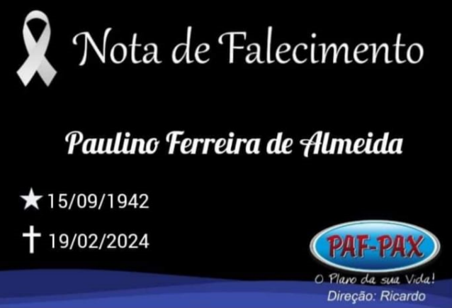 Comunicamos com pesar o falecimento de Paulino Ferreira de Almeida, de 81 anos.