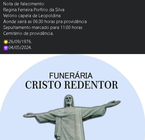 O velório está sendo realizado na Capela Mortuária Lions Clube, em Leopoldina. De onde saíra as 06:30h para Providência.