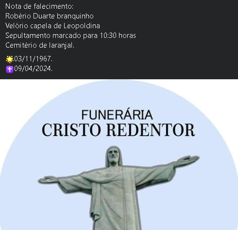 Comunicamos com pesar o falecimento de Robério Duarte Branquinho, de 56 anos.