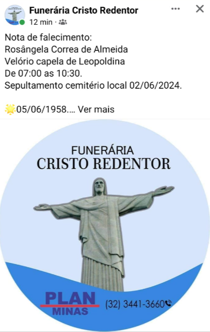 O velório acontecerá na Capela Mortuária Lions Clube, em Leopoldina, das 07:00 às 10:30.