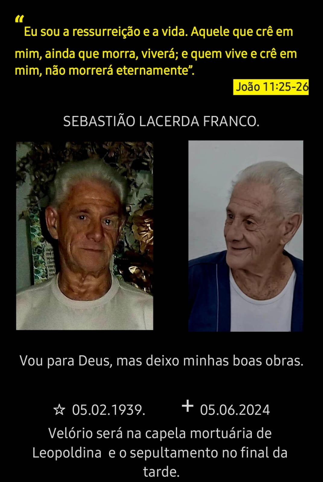 Comunicamos com pesar o falecimento de Sebastião Lacerda Franco, de 84 anos.