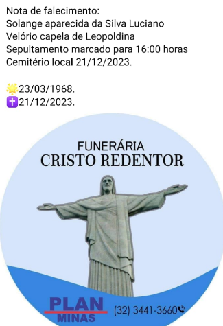 O sepultamento será na quinta-feira (21 de dezembro), às 16:00h no Cemitério de Leopoldina.