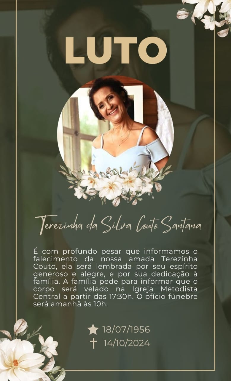 Com profundo pesar, informamos o falecimento de Terezinha da Silva Couto Santana, de 68 anos.