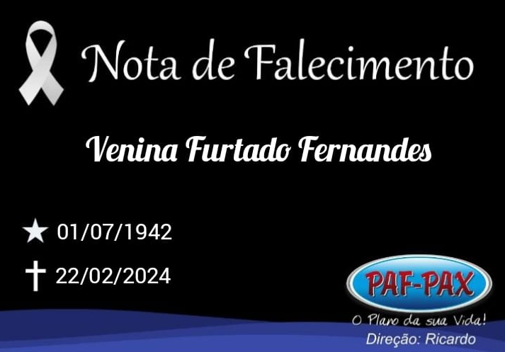 Comunicamos com pesar o falecimento de Venina Furtado Fernandes, de 81 anos.