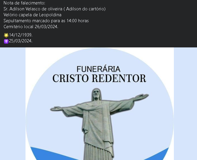 Comunicamos com pesar o falecimento do Sr. Adilson Velasco de Oliveira (Adilson do Cartório), de 84 anos.