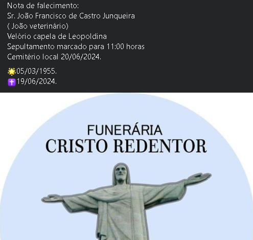 O sepultamento está marcado para as 11:00h da quinta-feira (20 de junho), no Cemitério de Leopoldina.