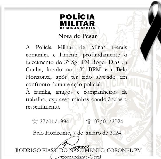 A Polícia Militar de Minas Gerais comunica e lamenta profundamente o falecimento do 3º Sargento PM Roger Dias da Cunha, lotado no 13º BPM em Belo Horizonte, após ter sido alvejado em confronto durante ação policial.